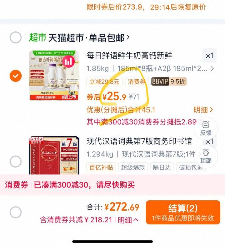 1,每日鲜语鲜牛奶185ml*8瓶+A2β-酪蛋白鲜奶185ml*2瓶