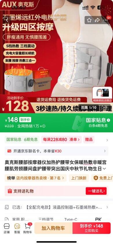 踩大雷!首先,后面是一整块钢板,超级超级重,没病都给戴出病,徒增腰部负担。大家买的时候一定要注意看是几个钢板几根钢条。其次,它不需要插电是挺方便,但是它的功能是在侧边有一个触控板,这个是光滑面的,特别容易误触,手在上面摸一下就启动了震动,换了温度,而且整个触控板是用纽扣钉起来的,也很容易掉。最后,所谓的按摩就是跟手机震动一样的,没有丝毫作用就是纯震,加热也需要至少十分钟才能热起来,并且也没有很热,还不如暖宝宝。所以买的时候不需要买自带震动和加热的,一点用没有。