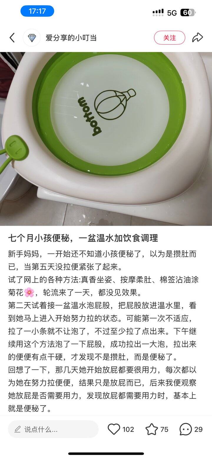 吃辅食加了不少油也还是会便秘,宝宝两天多没拉臭臭了,紧急买了小皮的西梅泥(好爱吃[鄙视]),又做了研究买了乳果糖、开塞露,还没用上,先参考小红书的热水泡屁股法,终于拉了。做功课还发现吃香蕉并不能缓解便秘!以后不要吃香蕉了,不如西梅有用。