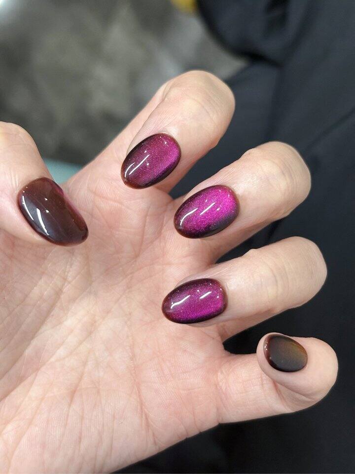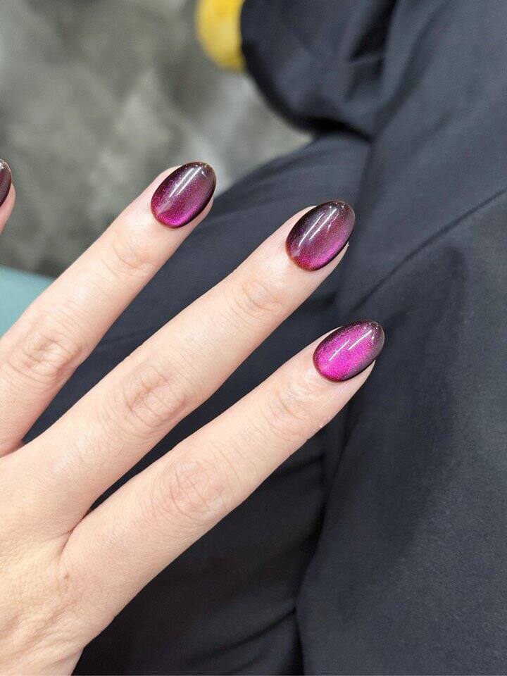 鱼鱼家的小短圆我真的很爱!大拇指稍微有点小,这个猫眼色号磁粉很细腻,手机镜头拍不出来哈哈。