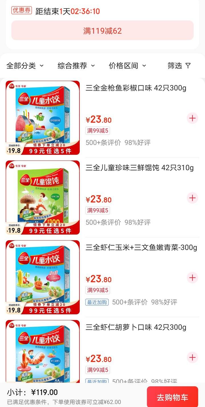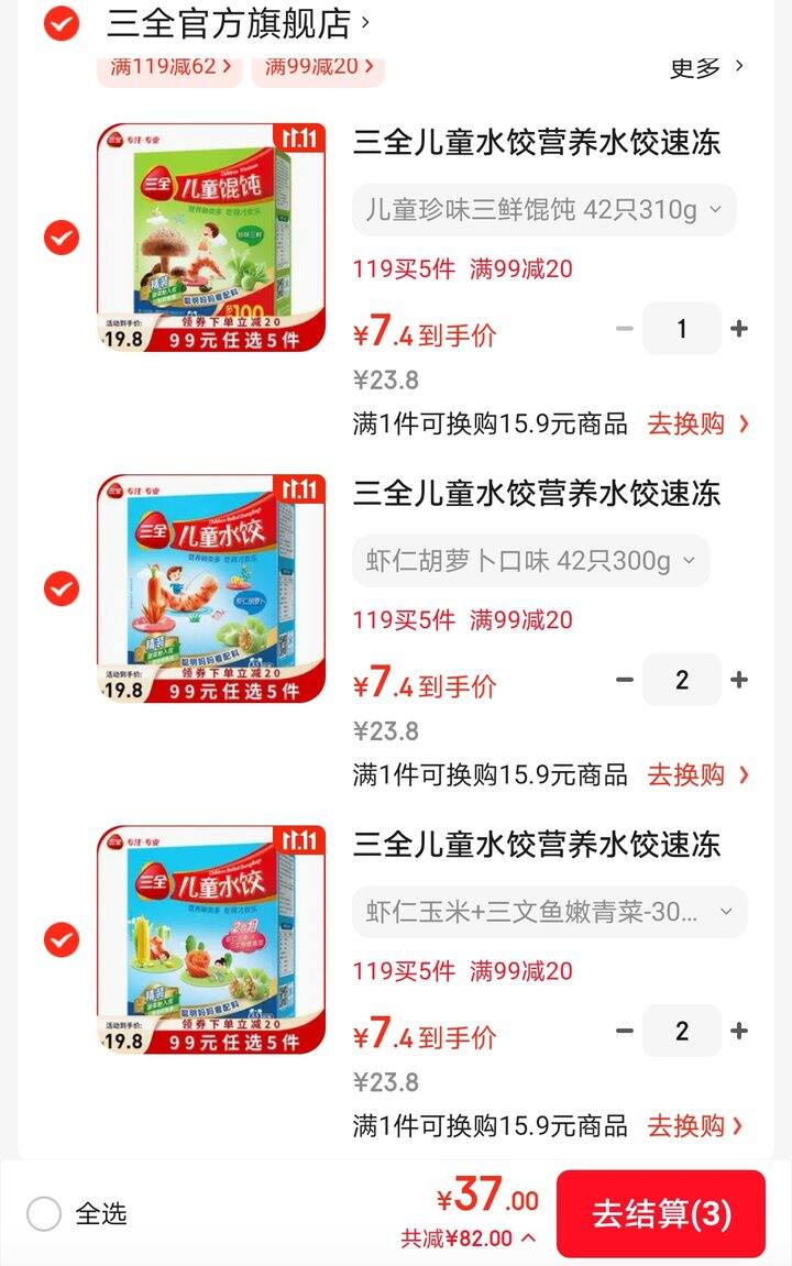 饺子馄饨任选5件,一盒到手7.4。比如,