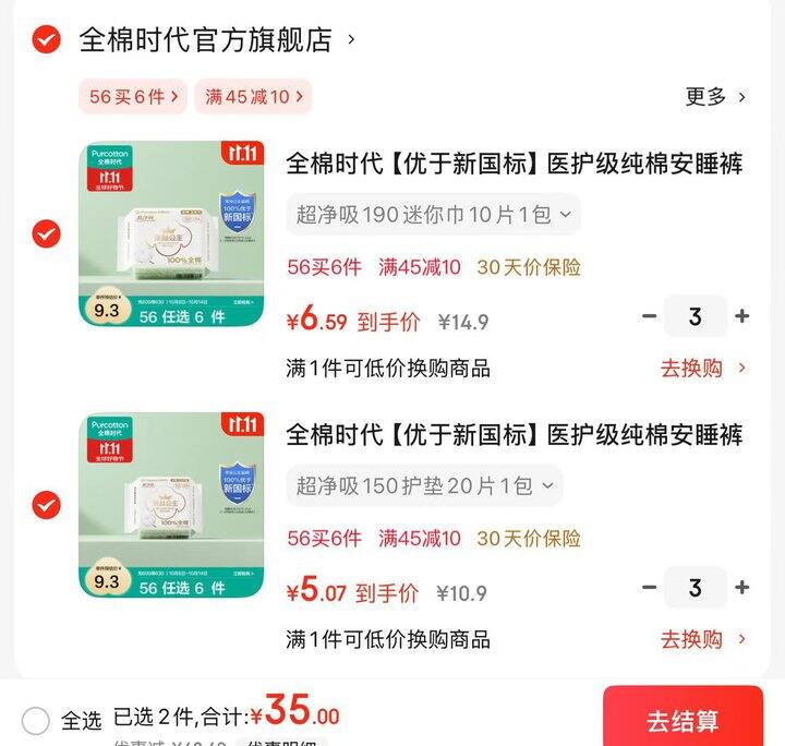 全棉时代医护级卫生巾全系列 超净吸150护垫20片💰0.29/片