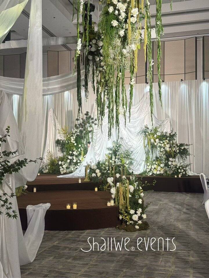 再分享一下场布吧,选了沉稳的白绿色系,没有用t台,用的大小的圆组成的路