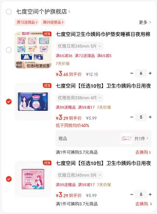 很好价!0.3/片!七度空间日夜组合任选+赠湿厕纸