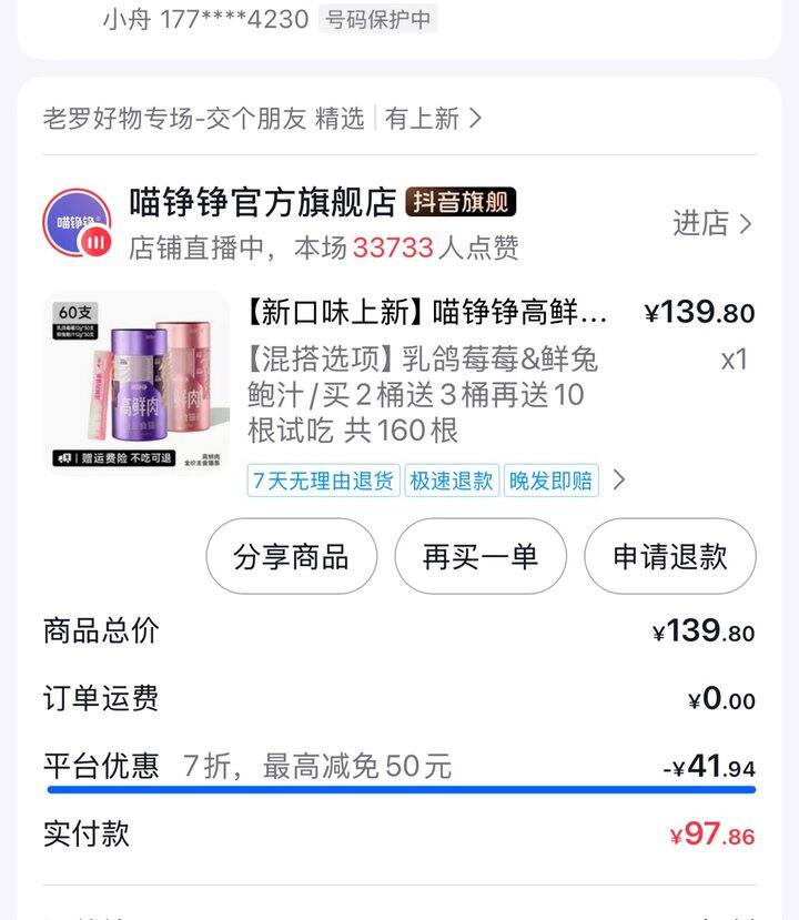 刚刷到鲜肉猫条,某音平台补贴42块