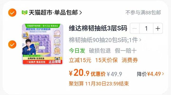维达棉韧立体美压花抽纸3层S码90抽20包,