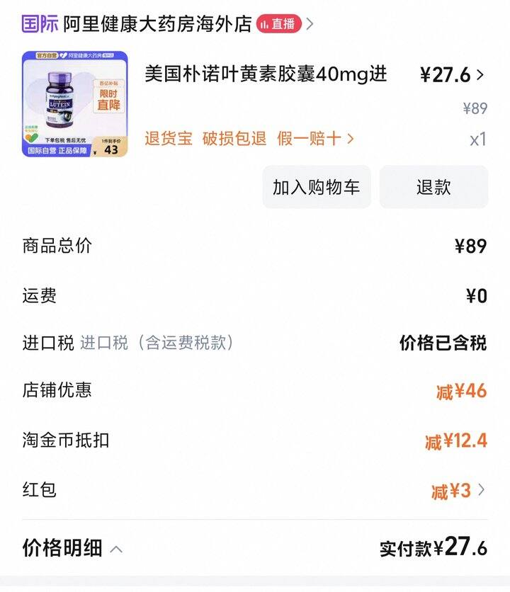 分享不了链接,之前路口姐妹分享的叶黄素现在百亿补贴40-12.4淘金币-3天猫通用红包-1.5一淘返利只需要25左右,有需要的姐妹可以看一下