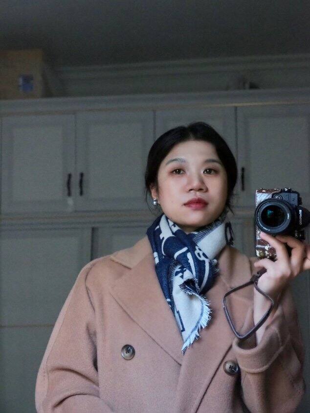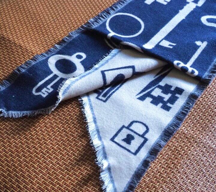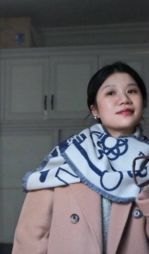 图案大但不夸张,我原本以为它跟披肩一样大没想到是正常大小,可塞进大衣领子,携带方便。藏蓝色很衬肤色,可以中和棕色/驼色大衣带来的暗沉。