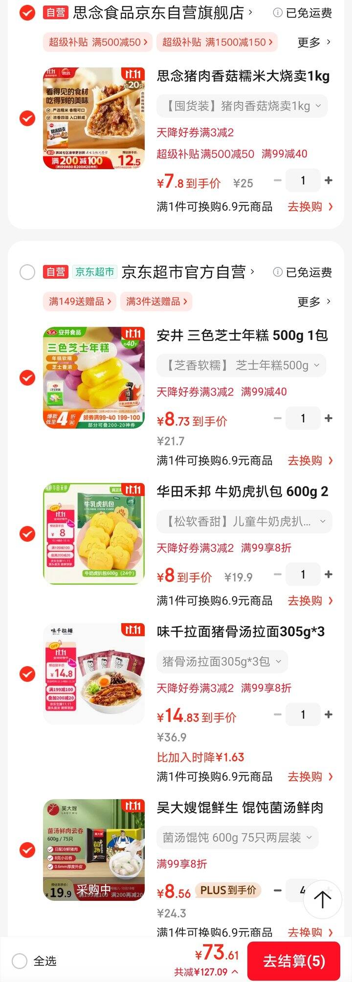 今天的活动真的挺好的,在200-100随便凑了一单,做到了73买200!馄饨才八块多一包,每样单价都很好,非常值得买。能选的品种很多,比如这样👇