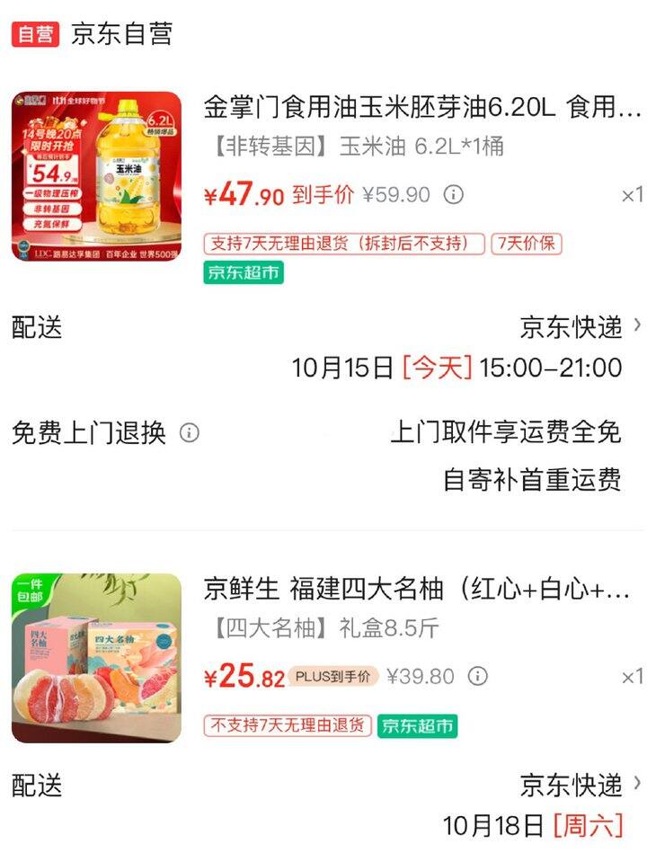 玉米油47.9/桶,柚子25.82(之前入了,这款好吃)