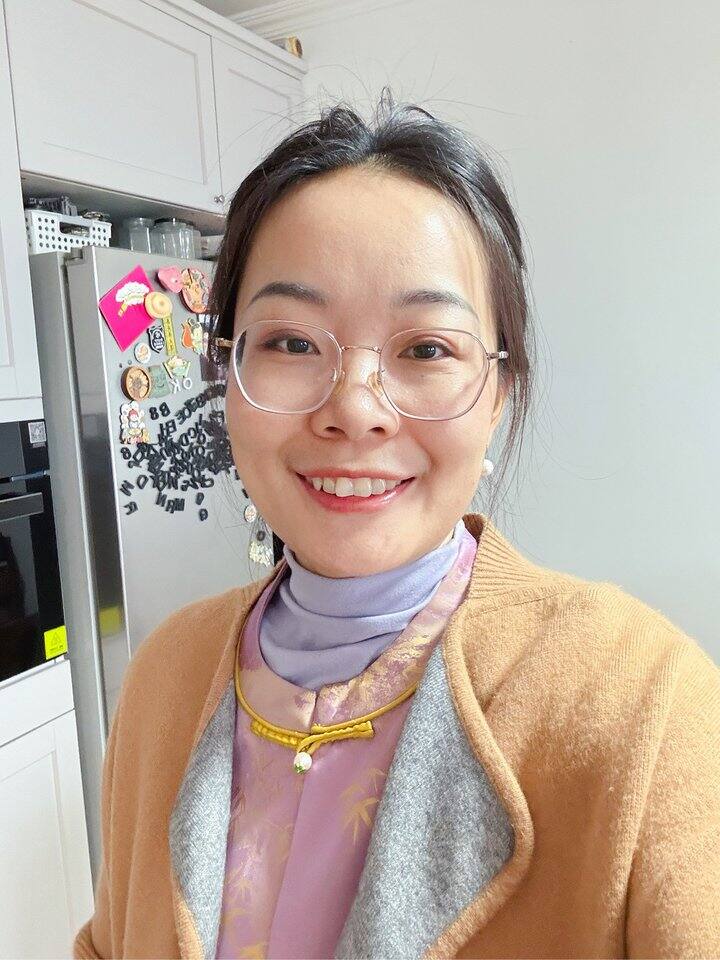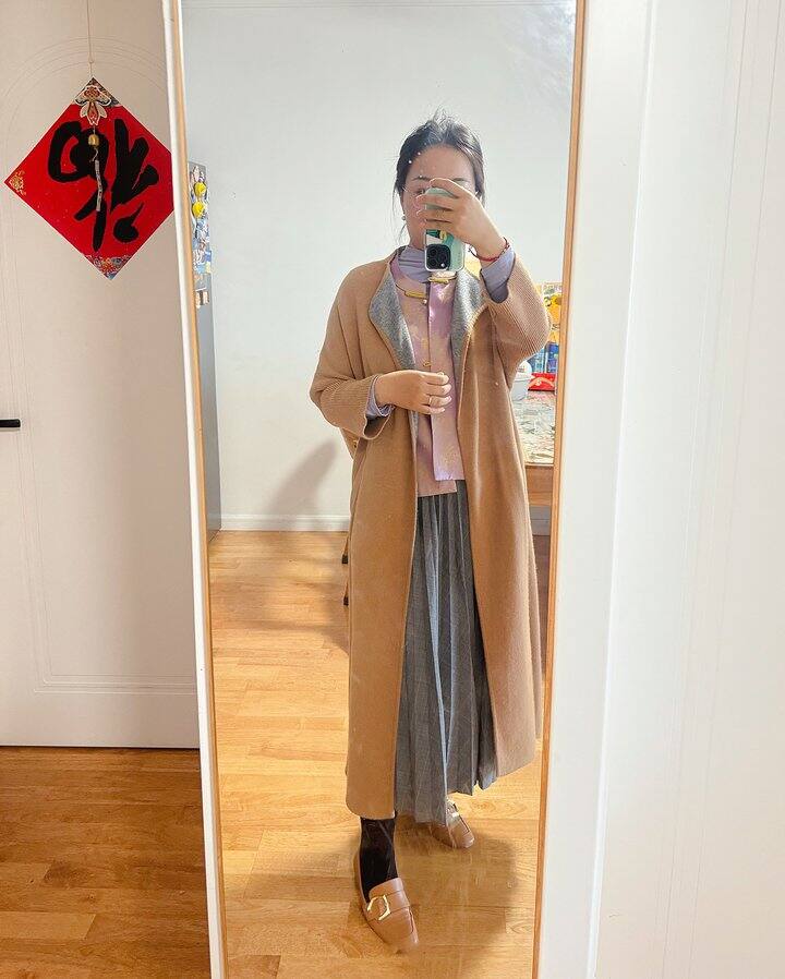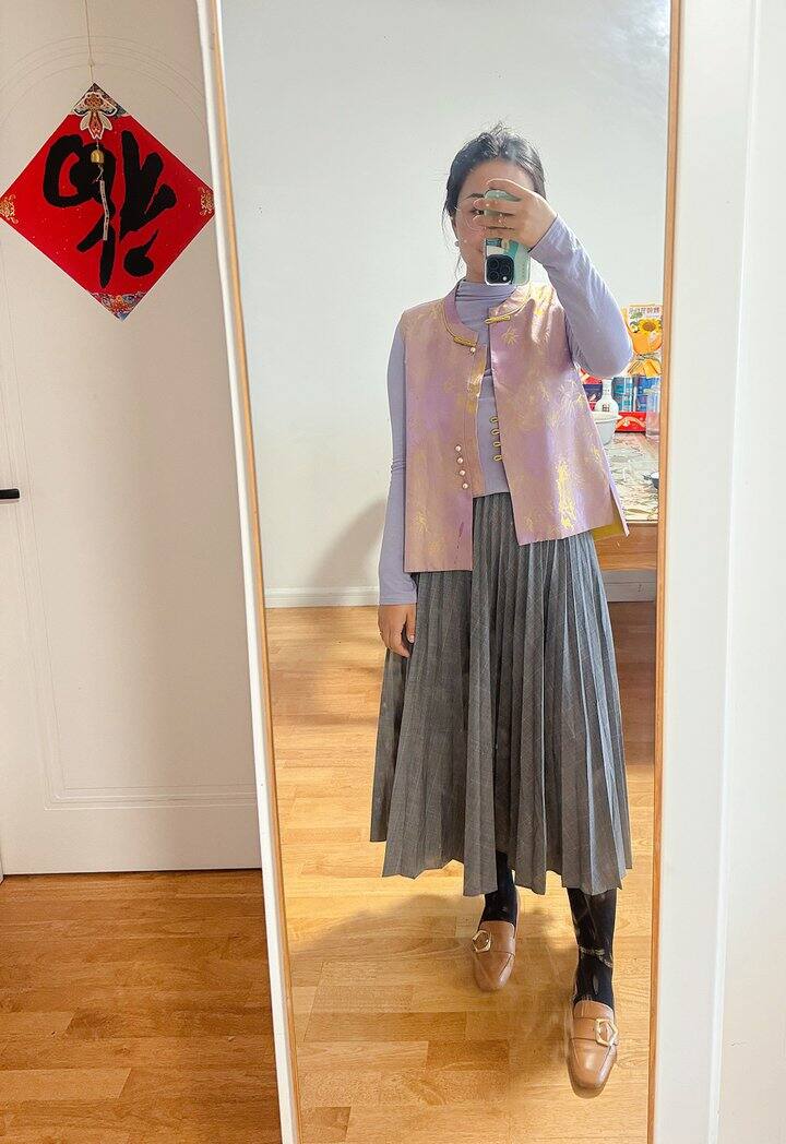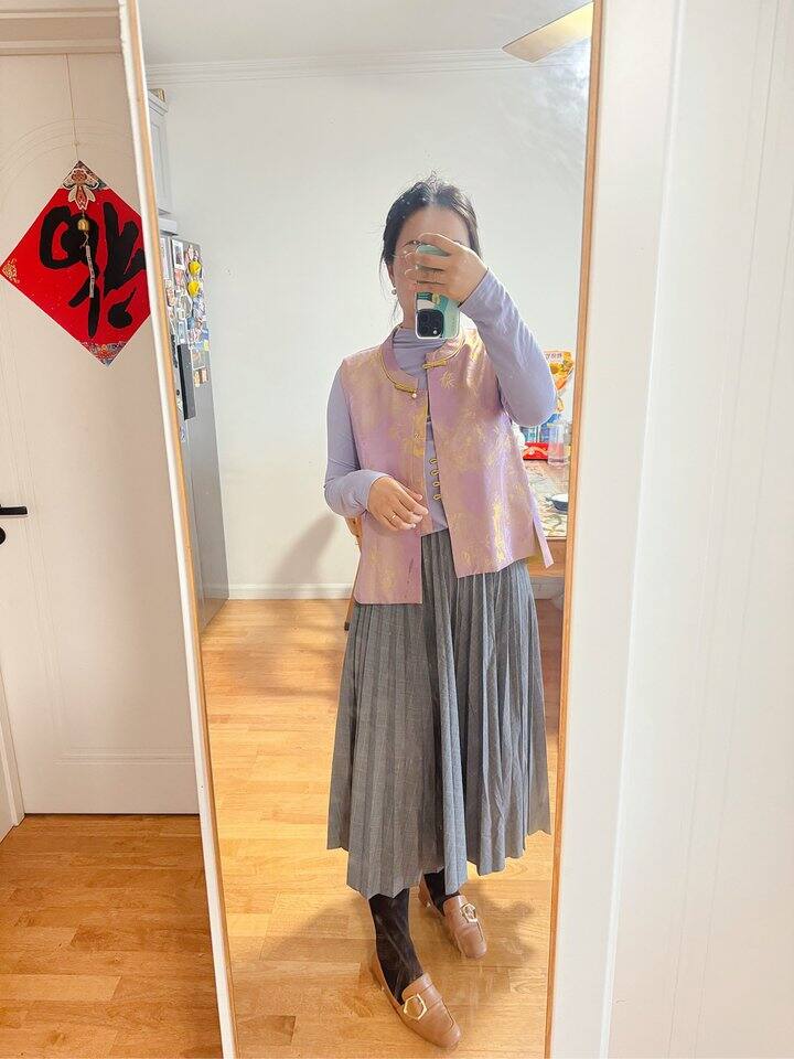 内搭紫色与马夹呼应,下身搭配了柔和的灰色,与大衣中色灰色形成呼应,鞋子同时也与大衣的主色调呼应。甚至眼影都选了粉紫色,我可太认真了。
