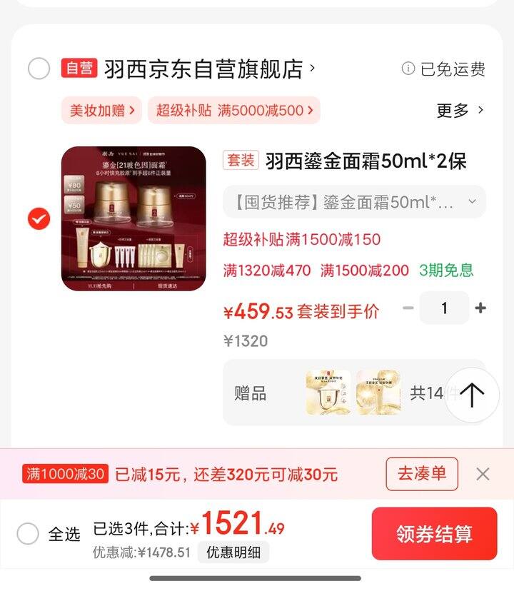 1、羽西鎏金面霜50ml*2保湿修护紧致淡纹玻色因生日礼物护肤品:https://u.jd.com/BaQqR6V,直播间领800-60券