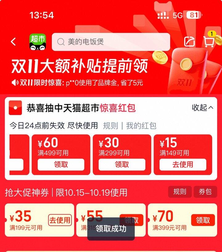 天猫超市首页领券中心有149-15,如果是99-10无需凑单