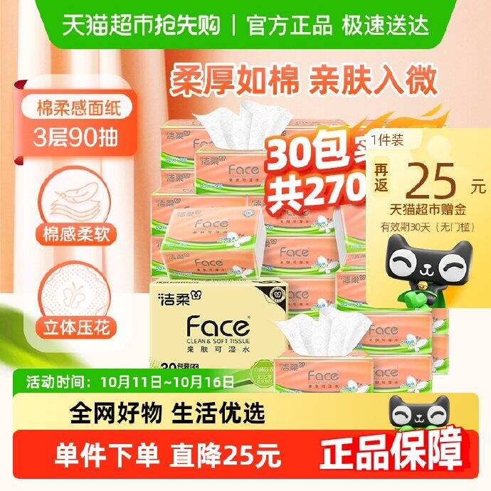 洁柔棉柔感立体压花抽纸3层90抽30包:https://s.click.taobao.com/N2ZPkDq,需要有10福袋,详情页进入超级补贴购买到手48.8,返25,返后到手23.8;