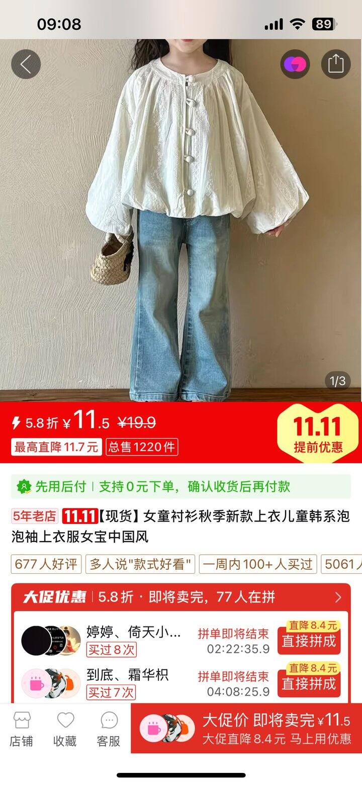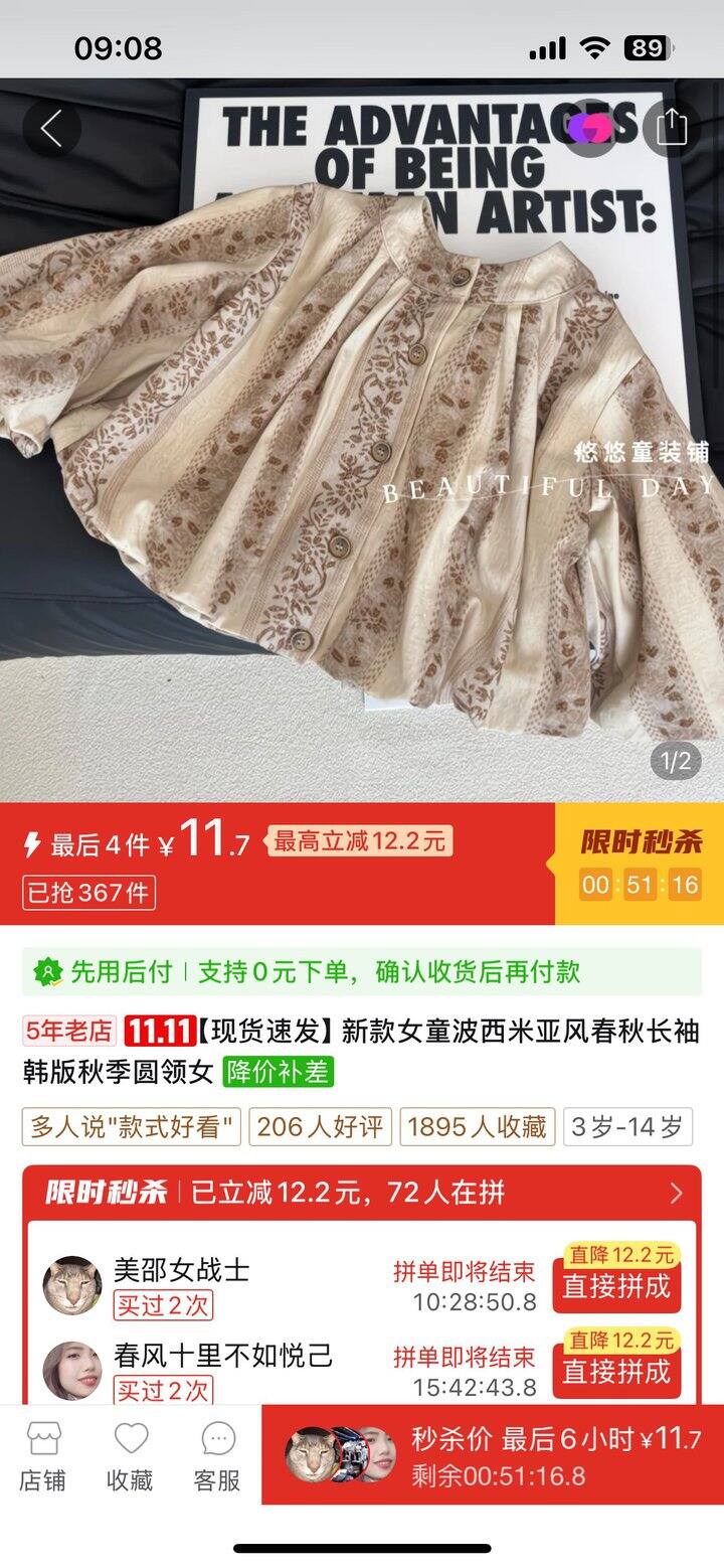 清早推荐个便宜的不可理喻的童装,是阿茶那里看来的,她是18块多买的,等我去看的时候发现只要11.7了,而且她说不是轻飘飘的那种差料子,我就买了。