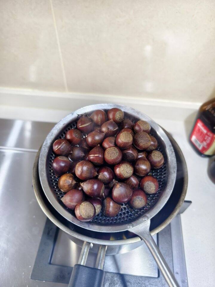 捞起后倒少许食用油,撒白糖,搅拌均匀。家里有蜂蜜也可以蜂蜜兑水后淋在板栗上,搅拌均匀。