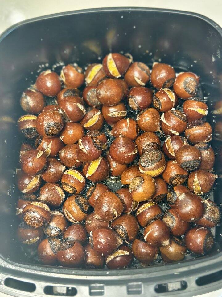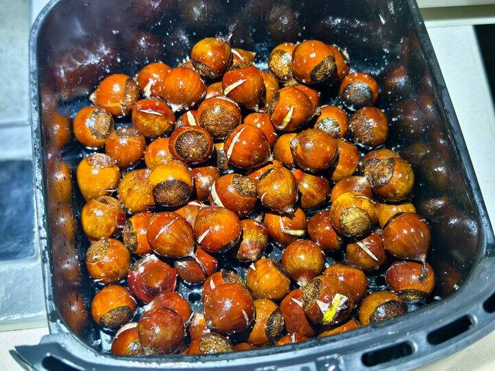 小缺点:很多白糖粘在板栗壳上,我准备下次试试看白糖少量兑水后再和板栗搅拌均匀再空气炸锅烤,应该会更入味些。