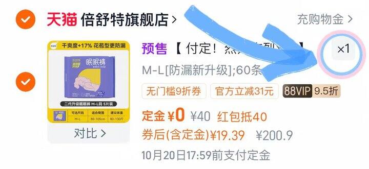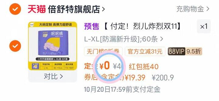 预售200.9,用200-20精致圈,立减31,商品卷80,88vip95折,免40定,消费9折