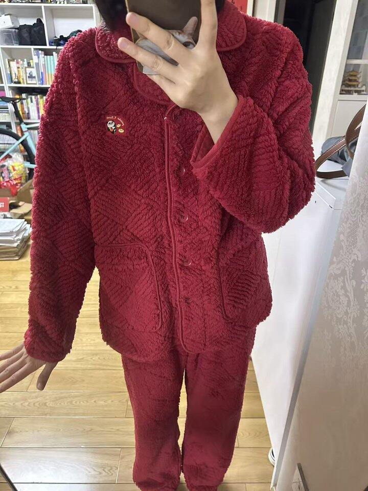 第一次买红色睡衣,不错不错很提气色的红。红豆质量不用说,一如既往的好,泡泡绒的材质我现在穿穿还有点热,不过后面降温就马上能穿了,怕冷星人特别需要。很软很腻,特别亲肤,163选的165的码子正合适,非常喜欢