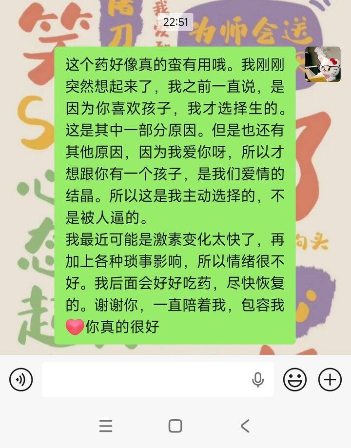 今天第一天吃抗抑郁药,吃完就感觉起药效了。如果有类似产后抑郁的姐妹,一定要尽快就医