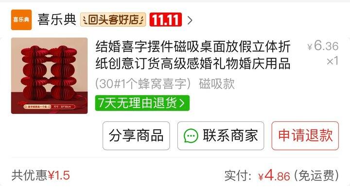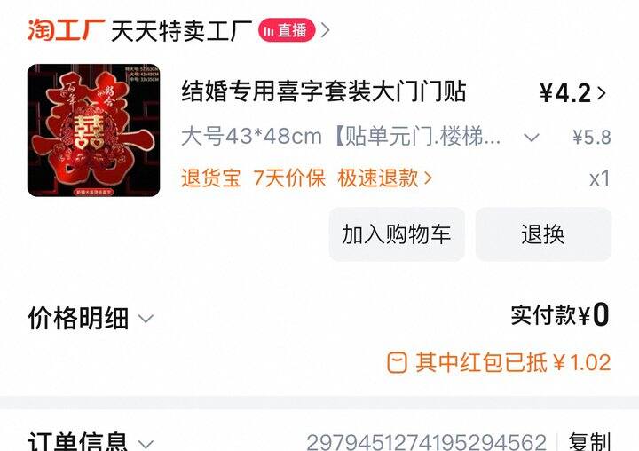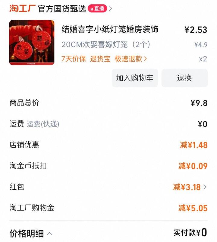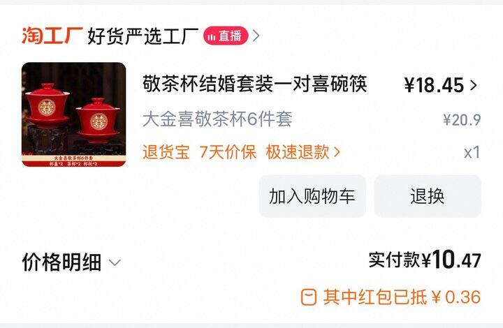 淘工厂,下单返,有每天邀请3人1.5r,可以攒着,买了敬茶的茶具,和些装饰喜字,质量也不错的。