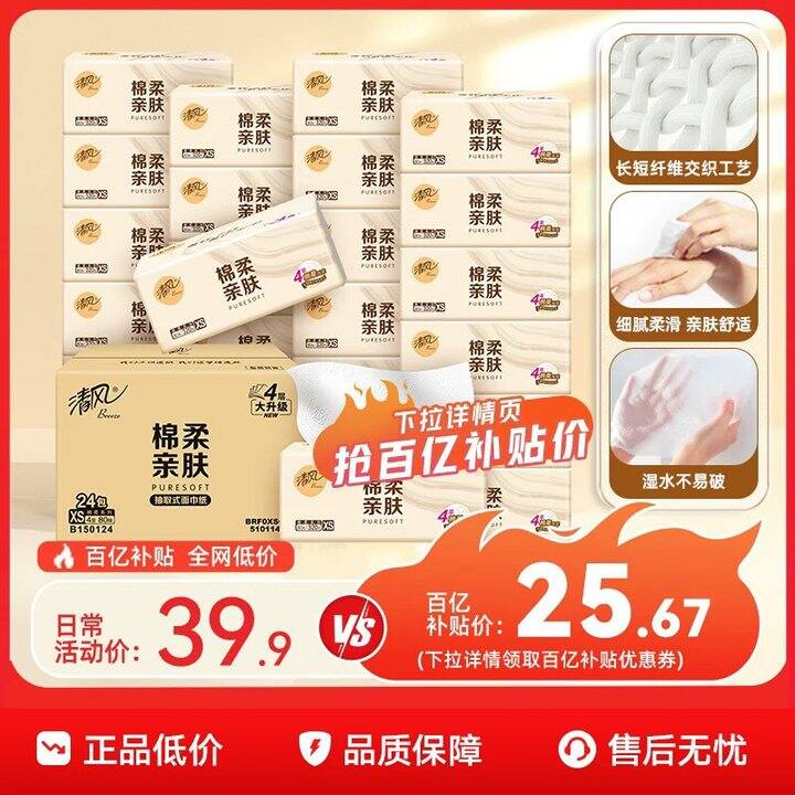 补贴!清风原木抽纸4层80抽24包 25.67包邮