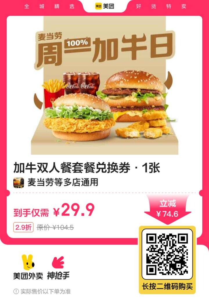 麦当劳 加牛双人餐套餐【29.9】