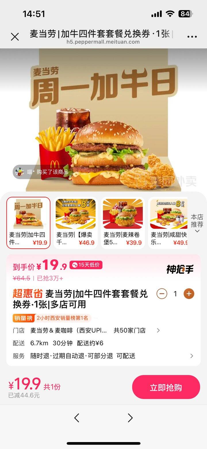 💥巨无霸/双吉[汉堡]+[薯条]+麦辣鸡翅/鸡块+中可
