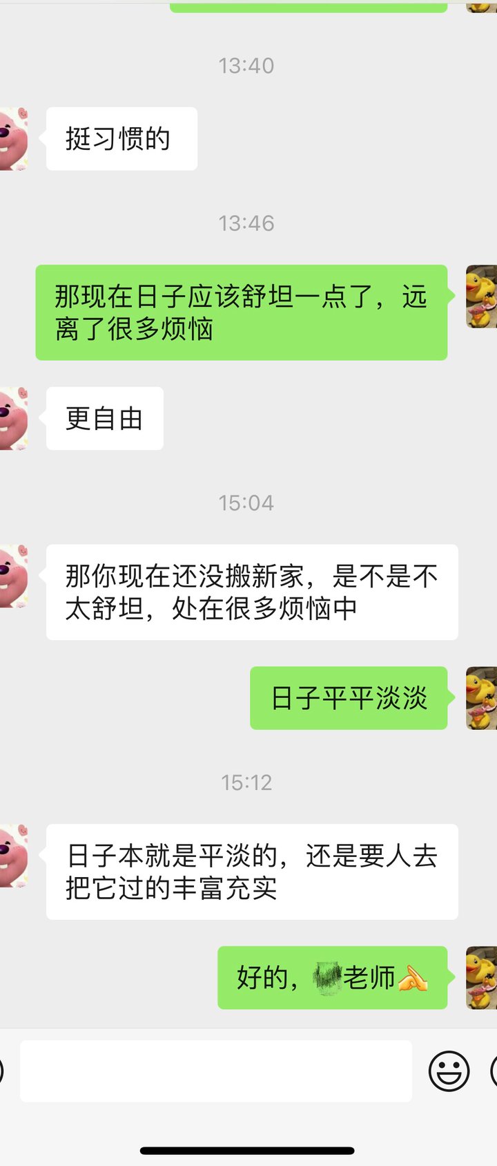 截图二:今天给我发消息了,我就调侃了一下。对方发了个表情。我也没有接话了。下午想想看还是关心一下对方,就问新家是否住的习惯(上一次见面,她邀请我和几个朋友去新家吃饭,当时她自己说新家搬进来住有点不习惯。在搬进新家之前,她和公婆一起住,之前和我吐槽过与婆婆之间的矛盾,烦心事)