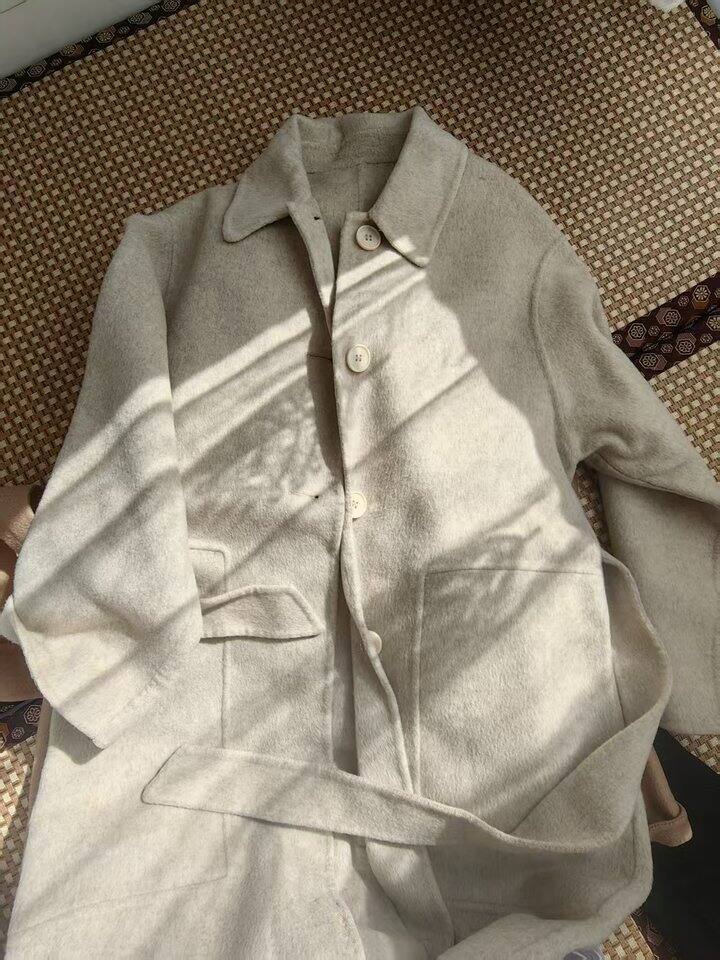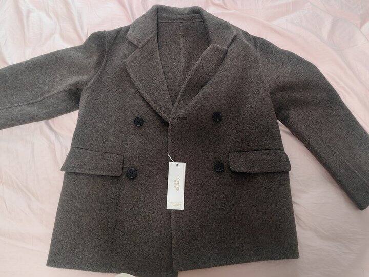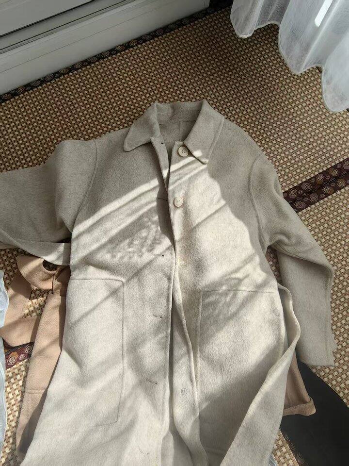 到手手感很厚重,成分90的澳毛,10的羊驼毛,进口澳毛款,澳毛本身贵+衣服长、会比普通的贵。说一下总体感受,拿到手很有分量,我用婴儿称称了一下,克重2.395kg。