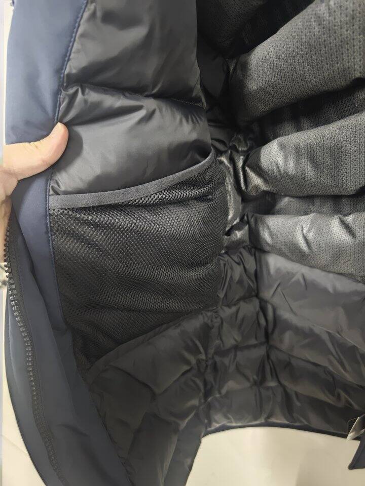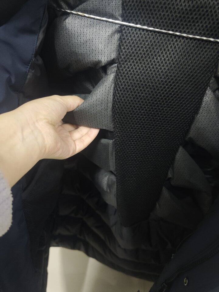 然后请看它背部的这个设计,简直是科技感满满有木有?一般来说,这样子的镂空海绵设计是出现在各种登山户外包包上的,也可能恕我孤陋寡闻,没想到咱奥也有这样子的巧思,而且旁边的羽绒是双层的,可以更好的透气不闷汗!同样也没见哪家是这样子设计的,甚至有的羽绒服后背就薄薄的一片,也不给咱装羽绒!