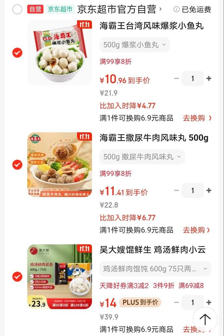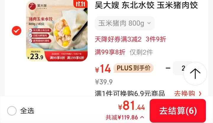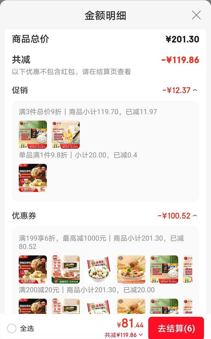 今天火锅丸料价格还不错~凑了一单满199打六折,饺子馄饨有3件9折。做到了81买200!也可以依葫芦画瓢,凑其他的。