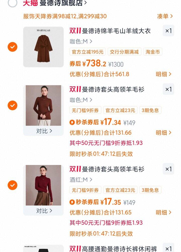 4、曼德诗山羊绒毛呢外套2025冬季新款气质收腰90%羊毛➕10%羊绒https://m.tb.cn/h.SQYKyFb,淘金币页面加购