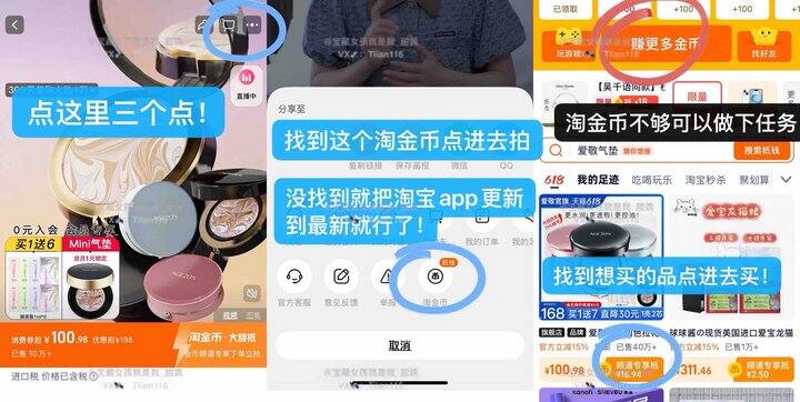 2️⃣进入商品页面先不加车,看教程点右上角三个点通过桃金币加购,需2600个金币不够做任务(看图)⚠️需要拍2个不同选项,提交记得勾选左下角9折券📎https://m.tb.cn/h.SQ159tK