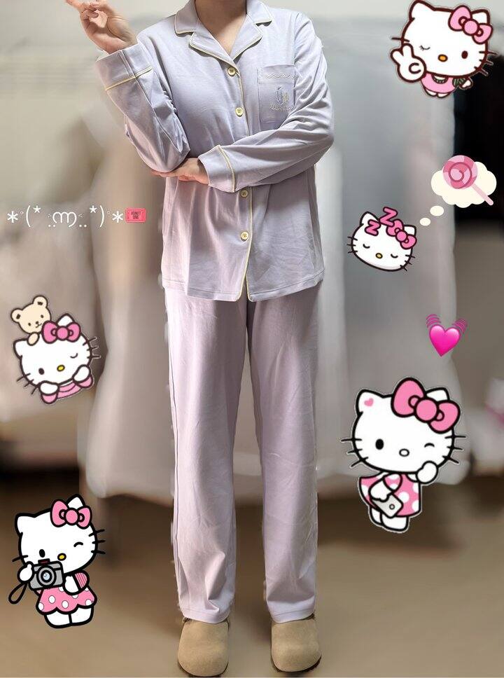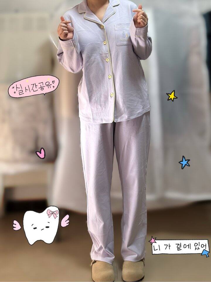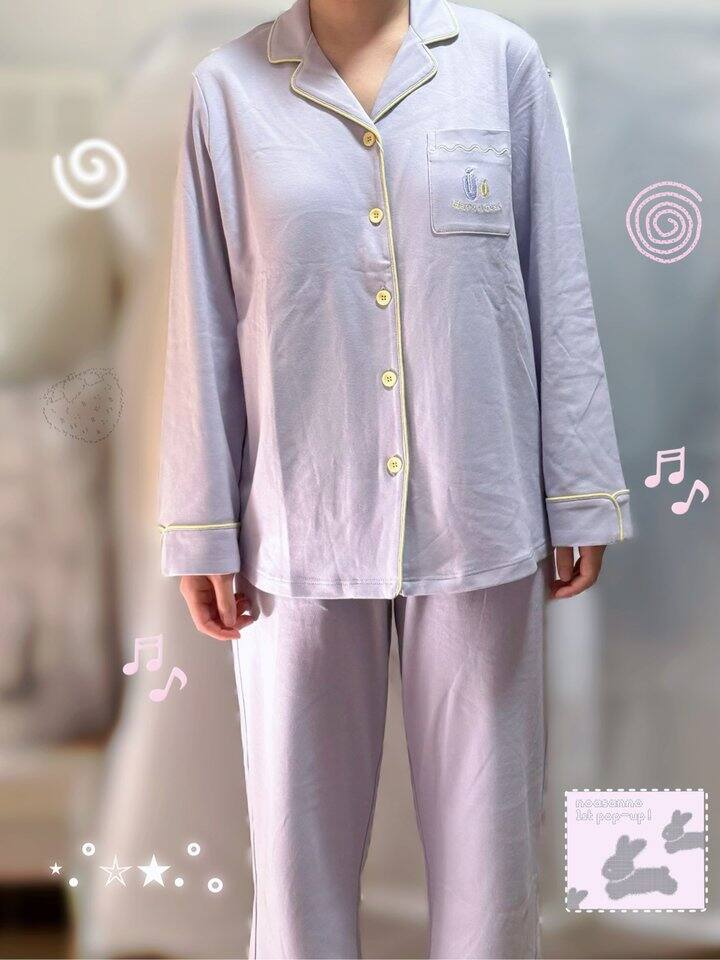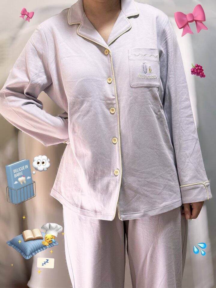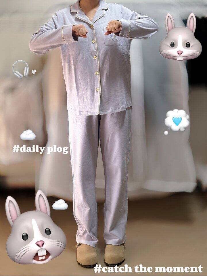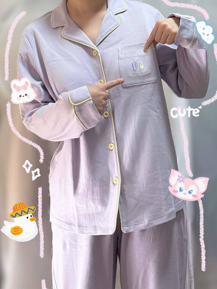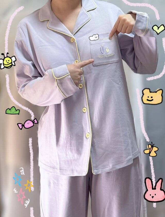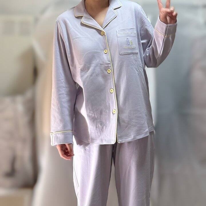 喜欢紫色的人真的没有办法抵挡这套睡衣,这个浅紫色真的太漂亮了,纽扣是黄色的,这个撞色的设计就很好看,优雅中添加了一丝活泼,自带胸垫很方便。衣服是纯棉的,款式简约大方,但是又有很多精致的小细节。