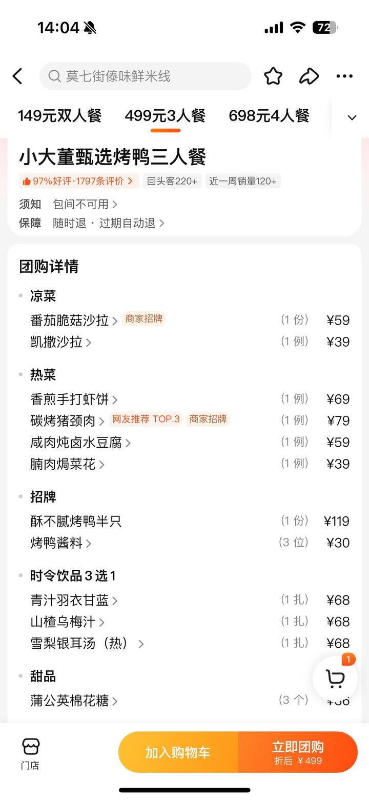 第一天晚上就安排了吃烤鸭,美团可以团购3人套餐。