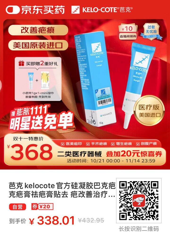 🛒【京东】芭克kelocote官方硅凝胶巴克疤克疤膏祛疤膏贴去 疤改善治疗疤痕15g