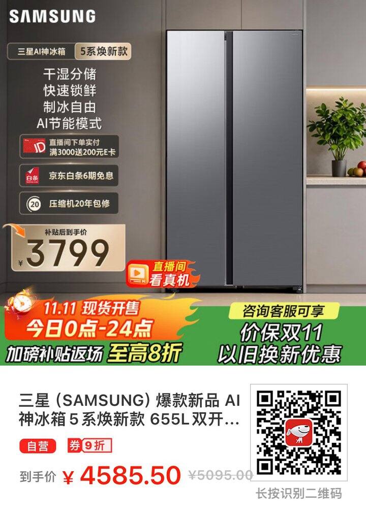 🔅【京东】三星(SAMSUNG)爆款新品 AI神冰箱5系焕新款 655L双开门超大容量家用冰箱变频风冷无霜政府补贴 银 RS70F65P1TSC