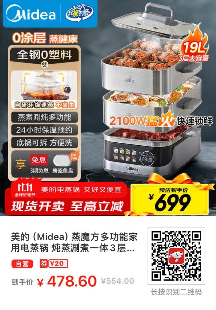 🔅【京东】美的(Midea)蒸魔方多功能家用电蒸锅 炖蒸涮煮一体3层 大容量 不锈钢可拆洗 自动断电2025新品 ZGS352302