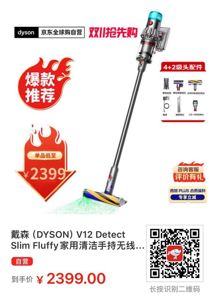 🔅【京东】戴森(DYSON)V12 Detect Slim Fluffy家用清洁手持无线除螨吸尘器 光学显尘 原装进口 超强大吸力 智能 可车载