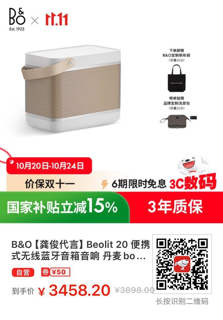 🛒【京东】B&O【龚俊代言】Beolit 20 便携式无线蓝牙音箱音响 丹麦bo室内桌面音响无线充电 国家补贴 双11礼物