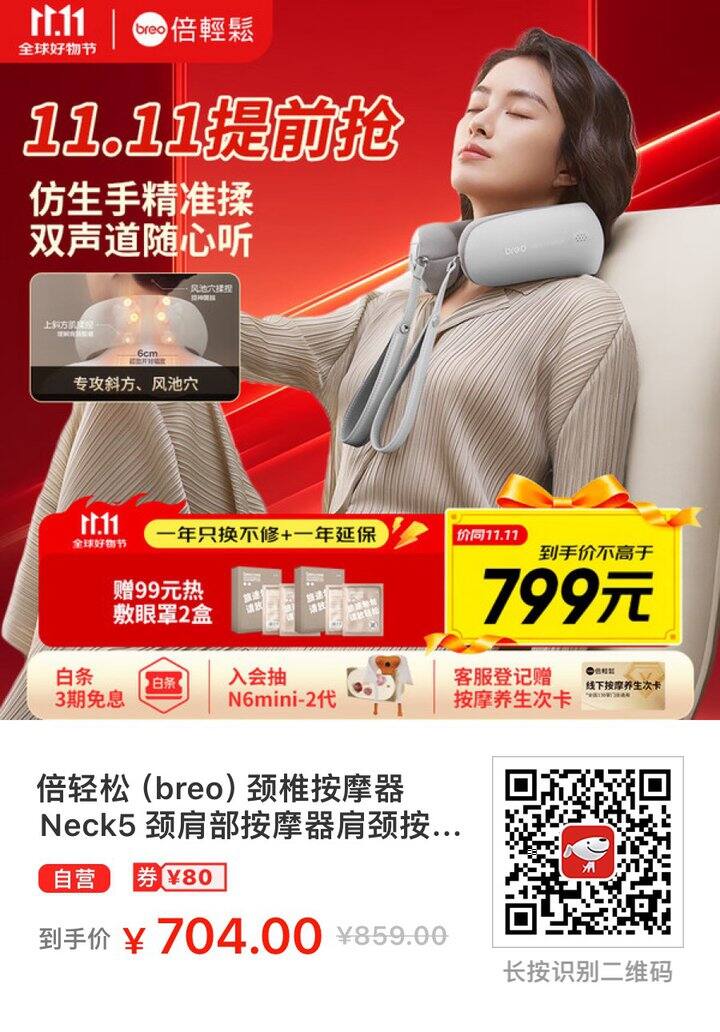 🔅【京东】倍轻松(breo)颈椎按摩器Neck5 颈肩部按摩器肩颈按摩仪按摩枕物理十指揉捏恒温热敷 送父母男女友实用生日礼物
