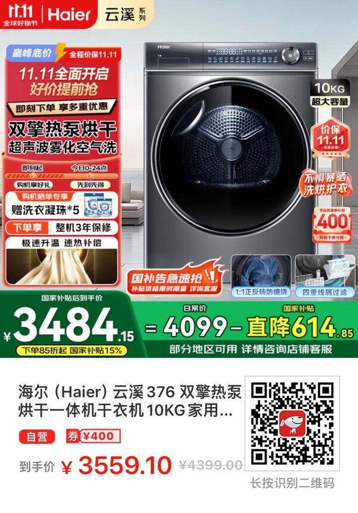 🔅【京东】海尔(Haier)云溪376 双擎热泵烘干一体机干衣机10KG家用 杀菌祛螨除潮 国家补贴 京东自营 HGY100-F376U1