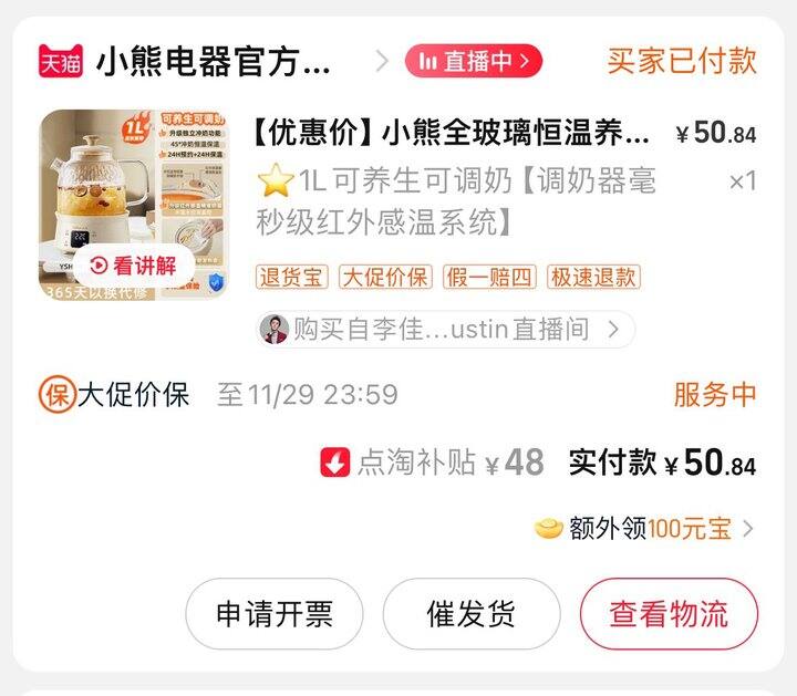 2倍补:算上李佳琦红包和补贴,50带走179的小熊全玻璃母婴级别的养生壶。