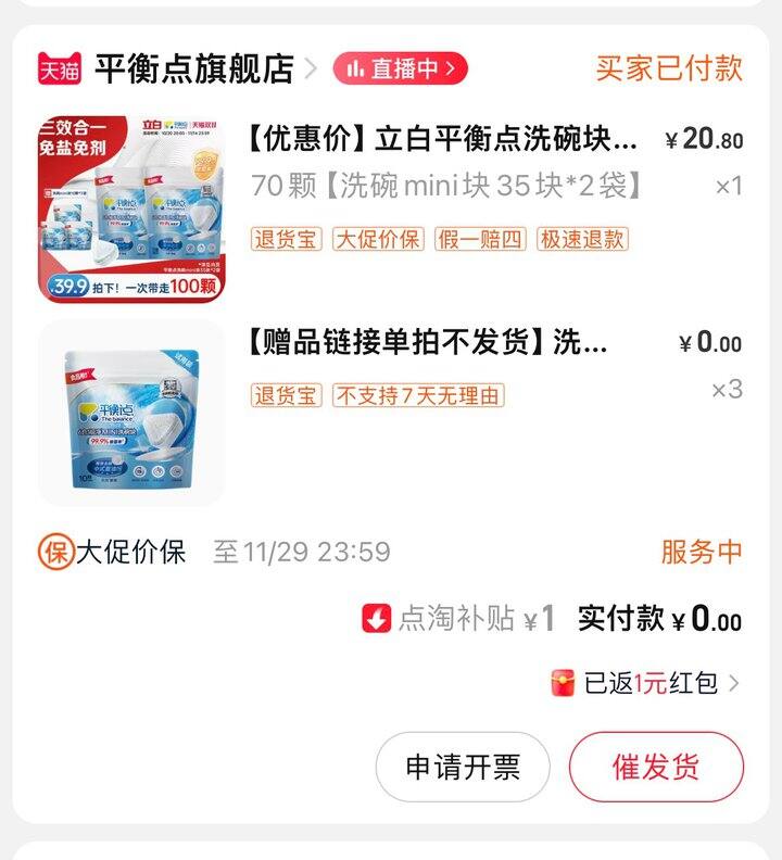 1倍补:决定下单一个刚需并且价格也很香并且补贴很少的商品,到手19.3带走100颗洗碗块。