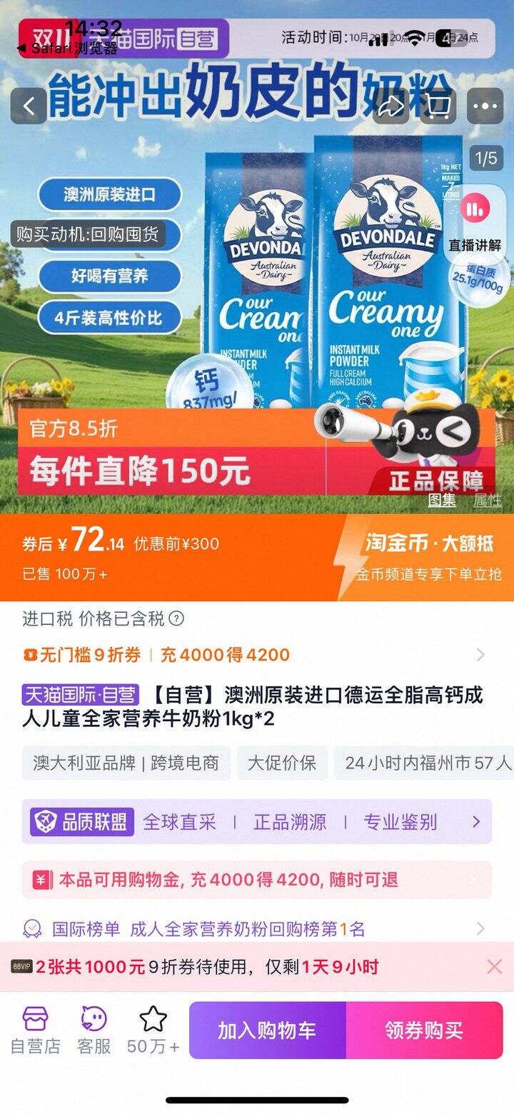 德运奶粉2kg 付款72元