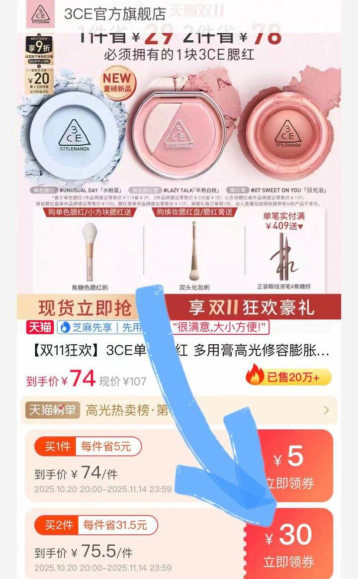 ❸领30r券后叠金币抵4r加购2件