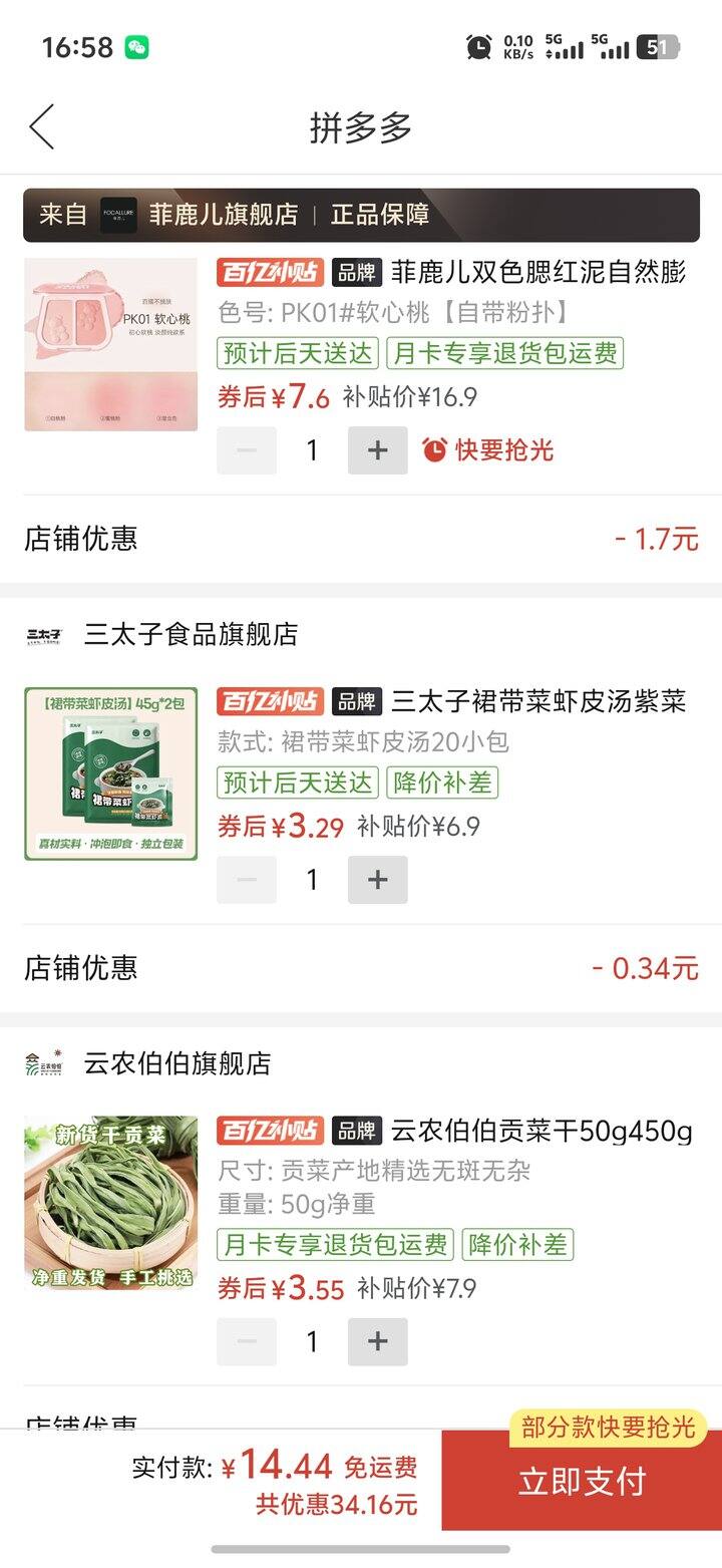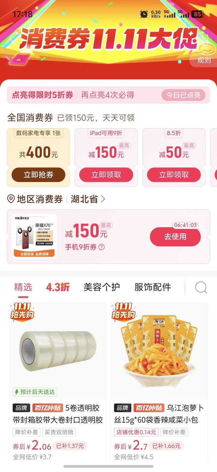 ⭐pdd首页——百亿补贴——5折点亮,连续7天内点亮5次,点亮之后,2天兑换领取,最高抵扣15块,可用的范围挺多的,适合买日用品抽纸柴米油盐。