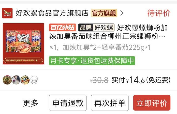 听说这个活动已经持续了1年,真是错过羊毛…前两期买了好欢螺螺蛳粉、贡菜、裙带菜汤、腮红。
