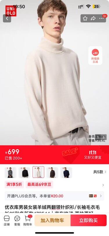 【京东】https://u.jd.com/pDLUf8H CA8680 「优衣库男装女装羊绒两翻领针织衫/长袖毛衣毛衫25秋冬新款478544 30 浅米色 L /175/100A」